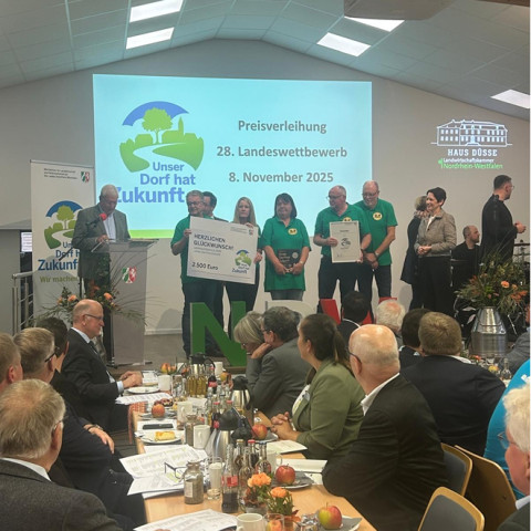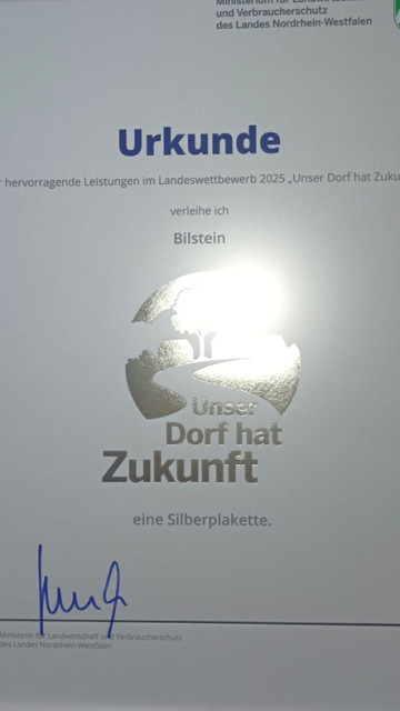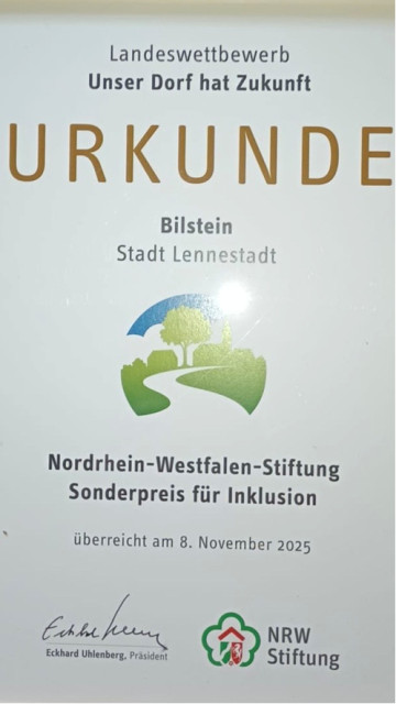 Strahlende Gesichter, stolze Bilsteiner und ein verdienter Doppelsieg: Am gestrigen Samstag, 9. November, nahm die Dorfgemeinschaft Bilstein im Haus Düsse in Bad Sassendorf die Silbermedaille im Landeswettbewerb „Unser Dorf hat Zukunft" entgegen – und das gleich mit einem herzlichen Extraapplaus für gelebte Inklusion!