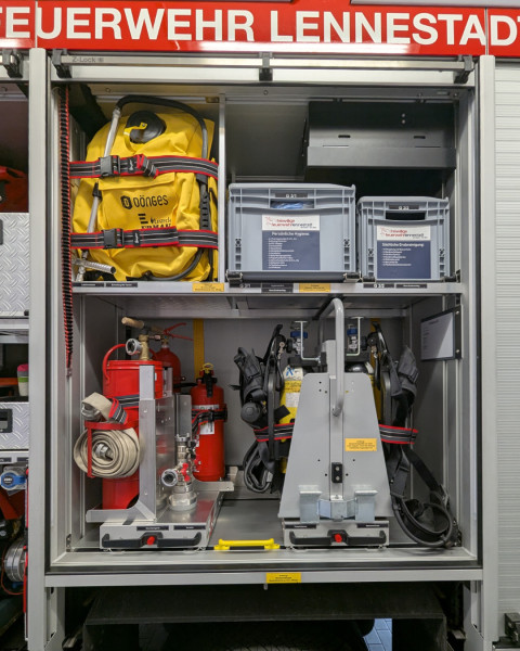 - Ausrüstung: Lichtmast, Atemschutzgeräte, Steckleiter, Schnellangriffseinrichtung,
